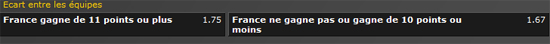 Il propose donc aussi un pari "écart". L'écart donné est en fait équivalent à un handicap (ici l'écart est de 11 points en défaveur de la France)